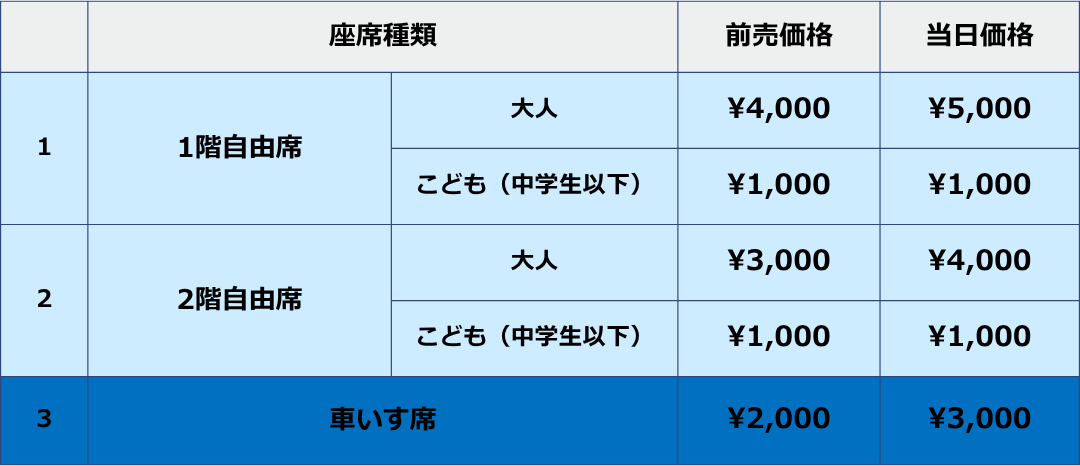 ※席種1~2は指定席、1列となります。座席を指定して購入可能です。